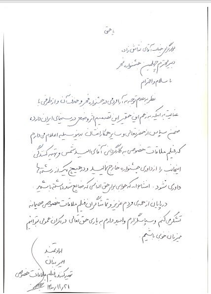 «نظر به عدم توجه به آرای مردمی در جشنواره فجر و حذف آن و از طرفی با عنایت به اینکه به زعم این حقیر این تصمیم اثر وضعی در سینمای ایران دارد، ضمن سپاس از حضرتعالی و سایر همکارانتان بدین وسیله اعلام میدارم که فیلم ملاقات خصوصی به کارگردانی آقای امید شمس و تهیهکنندگی اینجانب را از داوری جشنواره خارج نمایید و در هیچ یک از رشتهها داوری نشود.